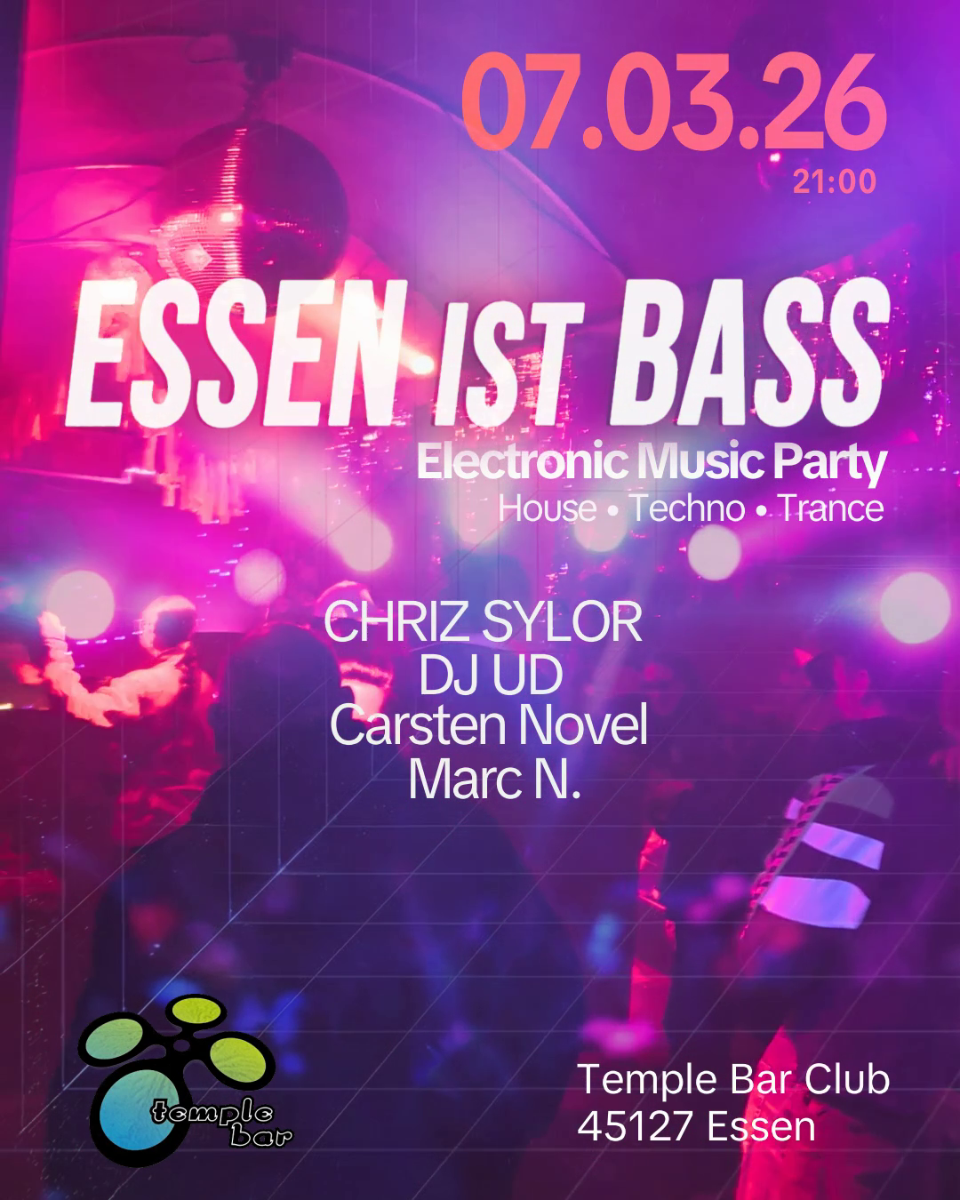 Mit treibenden Beats, hypnotischen Melodien und tiefen Basslines wird die Nacht zum Erlebnis. Diese Party verbindet Progressive House & Techno & Trance mit echtem Clubfeeling – tanzbar, energiegeladen und intensiv. Mitten im Herzen von Essen treffen elektronische Klänge auf urbanen Ruhrpott-Charakter und schaffen Raum zum Abschalten, Eintauchen und Tanzen bis spät in die Nacht.