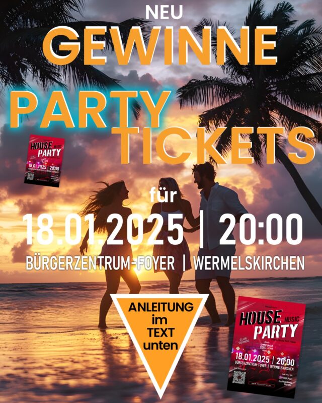 Wir verlosen 6×2 Party Tickets für unsere Party am 18.01.2025 in Wermelskirchen. Unsere DJs spielen auf dieser Party u.a. die Titel aus dem Instagram/Facebook Video. Erkenne 1-6 Titel aus unserem  Video und Poste bis 10.01.2025 in einem Kommentar die Titelnamen unter das Video. Deine Gewinnchance steigt mit der Zahl der erkannten Titel. Markiere dabei einen  Freund oder Freundin mit dem/der du auf die Party gehen möchtest in einem Kommentar unter dem Instagram oder Facebook Beitrag und Folge uns auf Instagram/Facebook, damit du auch in Zukunft über unsere House Music Partys auf dem laufenden bleibst.
